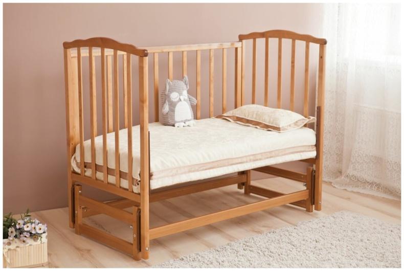 Третья позиция рейтинга за кроваткой для новорожденных отечественного производства. Спальное место устанавливается на одном из двух уровней. Передняя боковая планка опускается, обеспечивая более простой доступ родителей к ребёнку, и снижая тем самым нагрузку на позвоночник. На ножках есть колёсики, поэтому модель отличается мобильностью.