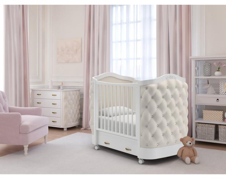Бортики покрыты мягкими накладками, которые защитят ребенка от травмирования. Имеется отделение для белья, а одна из боковых стенок опускается. Высота лежака может устанавливаться в двух положениях. Имеется механизм продольного укачивания.