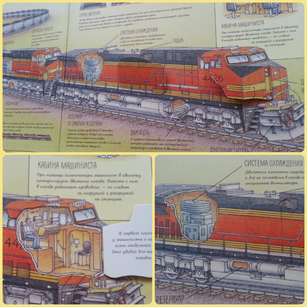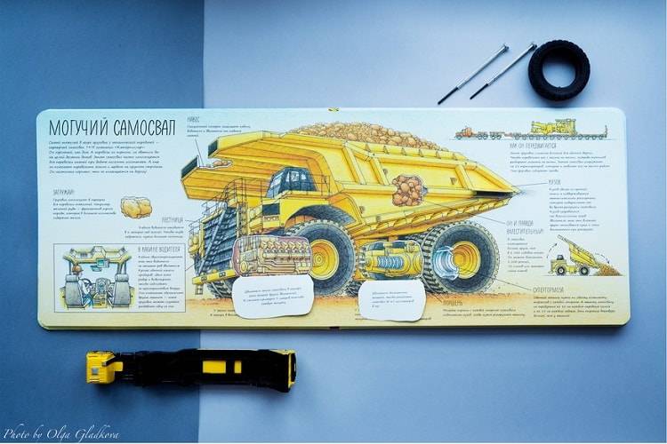 Внутреннее строение машин в книжке «Гигантский транспорт» удобно смотреть через специальные открывающиеся окошечки. Поиск этих окошечек — отдельное удовольствие для ребенка.