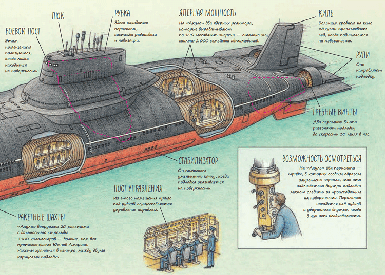 - самой большой подлодке в мире длиной в 17 автобусов — «Акула»