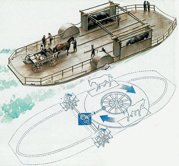 В конце 18-го века в США, а затем в Канаде, появился паром для перевозки людей и припасов по воде. Он приводился в движение живой силой, но не двуногой, а четырехногой.