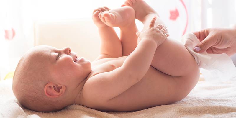 - Снимите грязный подгузник. Затем оботрите маленького кроху влажной салфеткой.