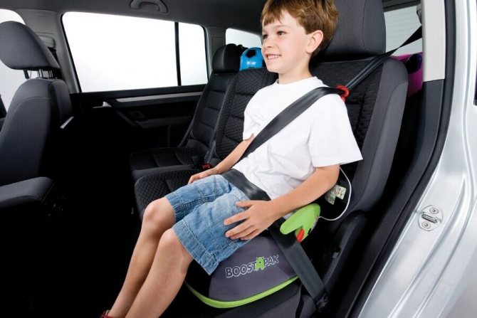 Бустер – это широкое приспособление для сидения без спинки. Оно обеспечивает правильное положение и высоту посадки маленького пассажира. Много в интернете замечаний, что бустер не гарантирует боковой защиты, однако на сегодня он является очень популярным и используется довольно широко. Малыш, посаженный в бустер, фиксируется штатным ремнём, который идёт диагонально через плечо и бережёт от травм и выпадения при аварийной ситуации. Бустер используется для перевозки детей группы массой от 25 до 36 кг.