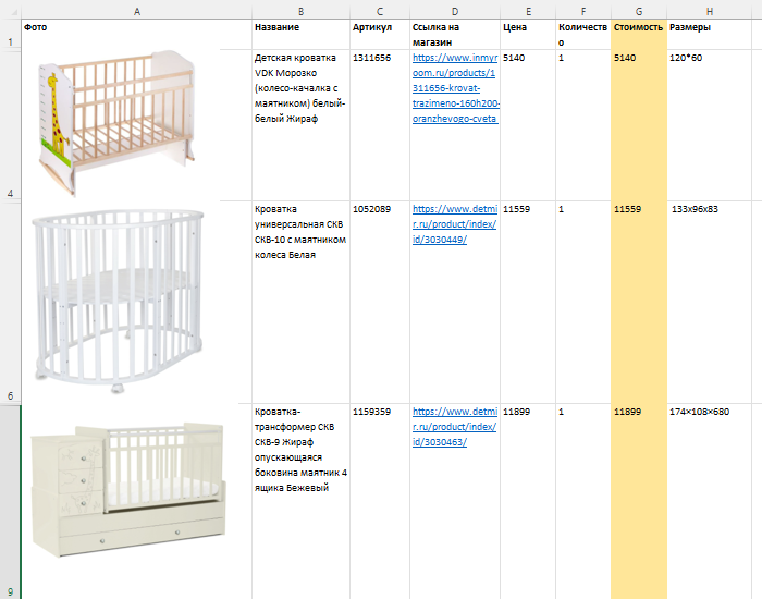 Пример сметы: собирают разные варианты моделей, чтобы можно было быстро найти мебель, подходящую по габаритам