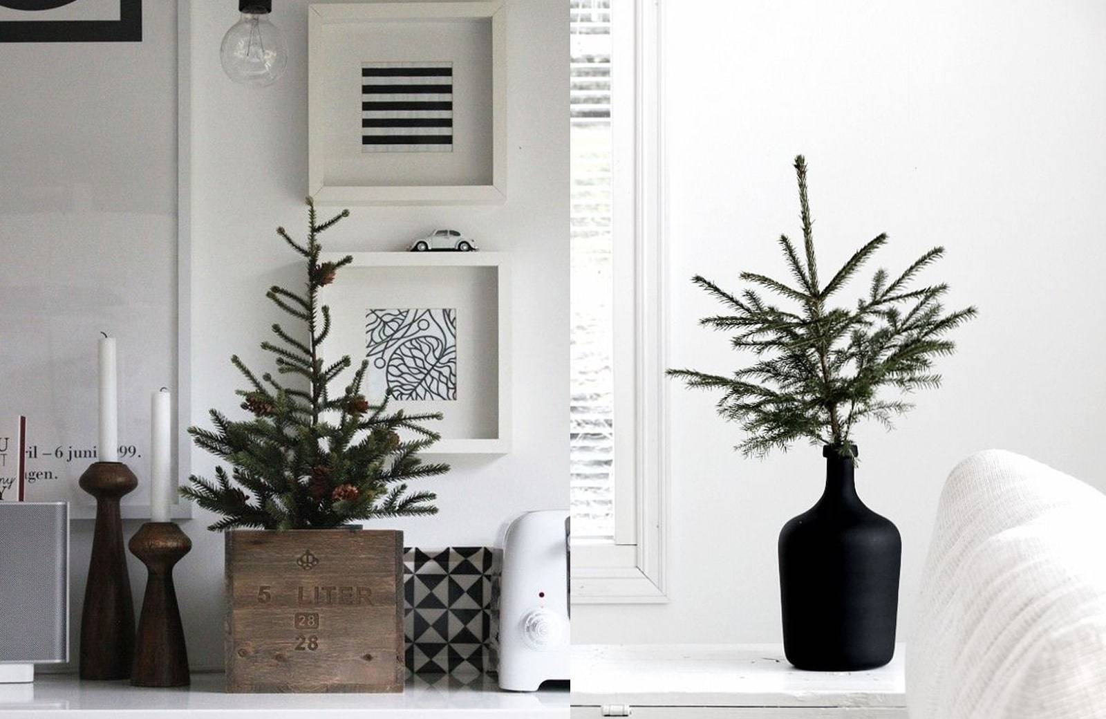 Также присмотритесь к маленьким елочкам в горшках. Или же сделайте свою версию из веточек с использованием натурального декора. Это отличное решение для небольшого помещения.