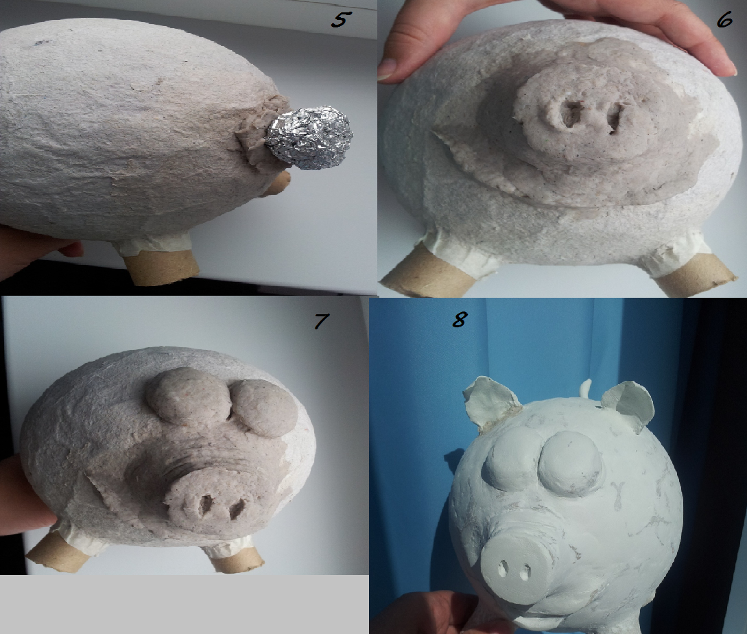Тубу от фольги поделите на четыре части и с помощью того же скотча прикрепите к свинке. Обмажьте папье.