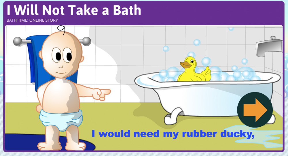 Сначала ребенок знакомится с коротким рассказом: например, о младенце, который не хотел купаться, или о том, как лягушка раскрашивала радугу. Каждое предложение находится на отдельном слайде: его медленно и отчетливо зачитывает диктор, а потом его могут повторить родители или, не торопясь, прочитать сам ребенок.