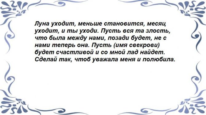 В период убывания луны невестке нужно напроситься в гости к свекрови. Войдя в дом, у порога сплюнуть 3 раза через правое плечо. Затем подобрать момент, когда женщина выйдет из комнаты, украдкой взять любую ее вещь (лучше всего подходит нижнее белье) и произнести заклинание.