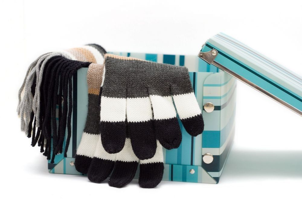 Для шарфов, шалей, косынок и перчаток выделите отдельный контейнер или тканевый мешок. Шарфы и шали скатайте в тугие рулоны. Кожаные перчатки обработайте спреем для кожи. Не забудьте положить в мешок или контейнер средство от моли.