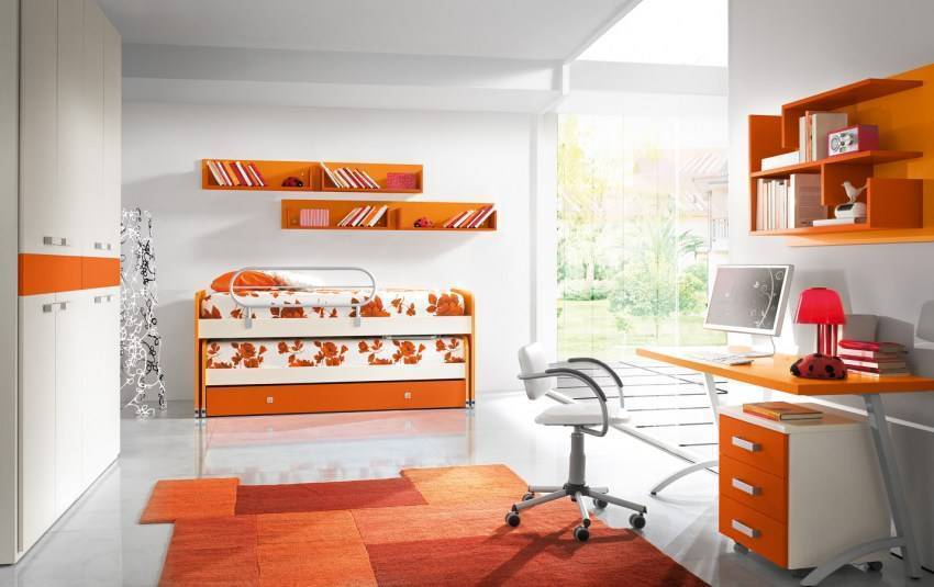 Оттенки желтого и оранжевого цвета ассоциируются с теплом и наполнят детскую спальню необходимым уютом. Зеленоватый, белый, бежевый послужат основой для дизайнерских идей подростков, а «фруктовые» тона персикового и абрикосового добавят мягкости характерному интерьеру для девушки.