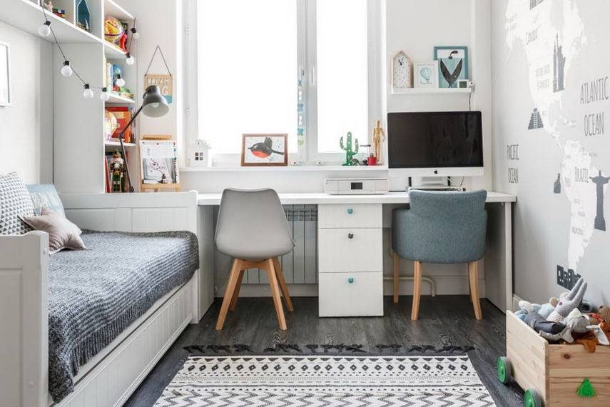 Расстановку мебели производят с максимальной экономией пространства, особенно в маленькой детской. Для этого кровать ставят в нишу из шкафов, например. Или устанавливают двухъярусную конструкцию, где сверху спальное место, а снизу — зона для учебы или хранения вещей.