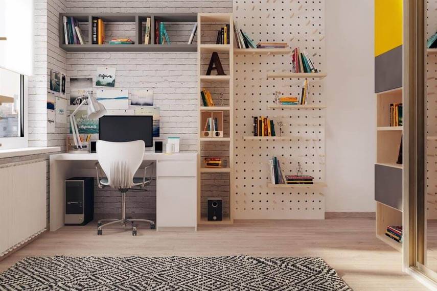 Рабочую зону стараются сдвинуть ближе к окну с естественным освещением. Дополнительно устанавливают подсветку, настольную лампу, светодиодную ленту. Основной свет — люстра или точки на потолке. Желательно, чтобы был установлен светильник над кроватью, чтобы не напрягать зрения во время чтения книг.