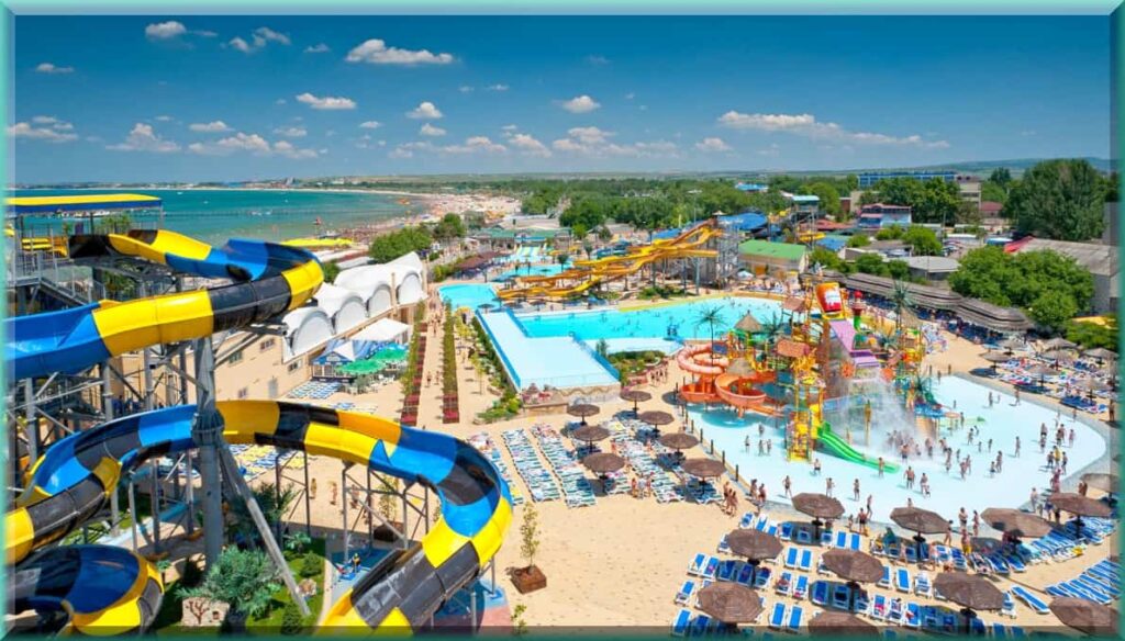 - Аквапарки. В Анапе их целых три. «Золотой пляж» (его Вы видите на фото к подзаголовку), «Тики-Так» и «Олимпия». Аквапарк — это всегда весело, это место, где можно с удовольствием провести целый день и отдохнуть с детьми.