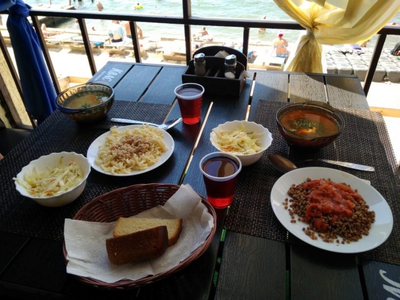 4. Бюджетное питание. В Анапе можно покушать очень даже сытно и вкусно за копейки — этот факт компенсирует остальные минусы. В местных столовых есть ланчи или комплексные обеды, где за 150 руб. можно взять 4 блюда — первое, второе, салат и компот. Мы брали всегда разный обед, где были включены котлета, рыба или шашлык, но всегда укладывались в 300 руб. на двоих!