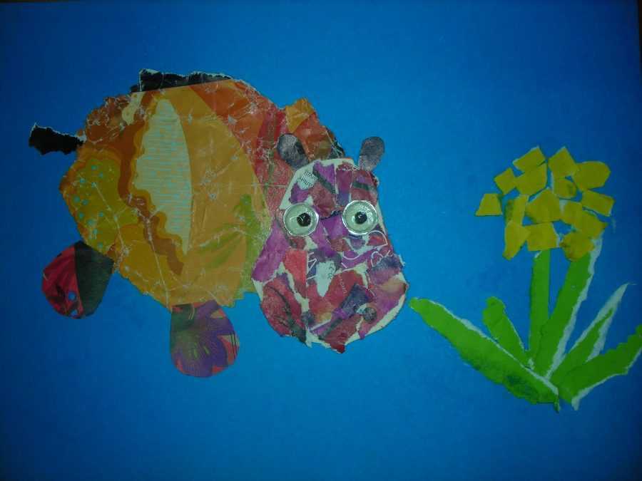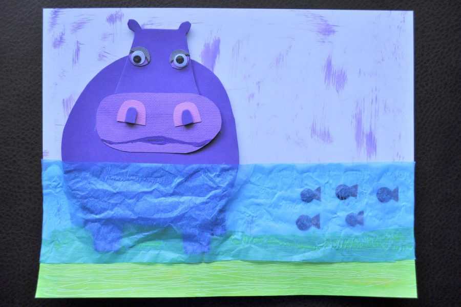Обожаемый всеми детишками бегемот делается из шероховатой бумаги. Вот почему он вызывает такой восторг. Плюс вода почти как «настоящая», прозрачная. Сквозь нее просвечивается тело. Для поделки белая бумага окрашивается в светлый голубой оттенок, который дает разведенная синяя гуашь.