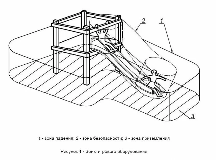 - Характеризует значения зоны игр, приземления, опоры, падения, неожиданные преграды, габариты оборудования и основания.