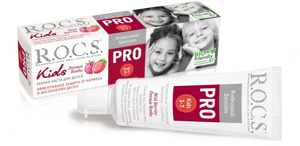 - R.O.C.S. Kids с разными вкусами – формирует на поверхности эмали фторидно-кальциевую пленку, защищающую от кариеса. К неприятным моментам можно отнести содержание сахара, ароматизаторов и парабенов, хотя последние исследования и показывают, что парабены почти не вредны;