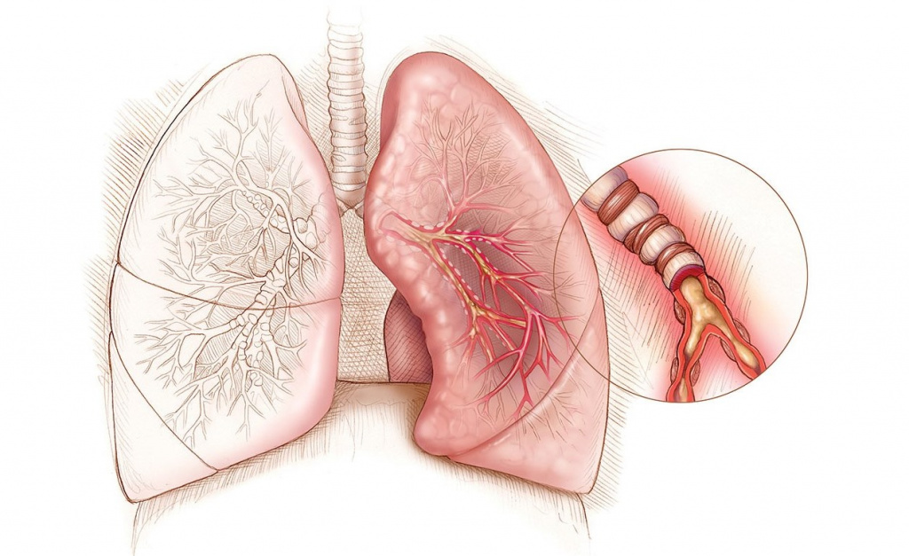 - Патологические состояния в легких и бронхах. Густой налет начинает образовываться, когда развивается бронхит, пневмония, рак легких, туберкулез, муковисцидоз, бронхиальная астма, легочная тромбоэмболия.