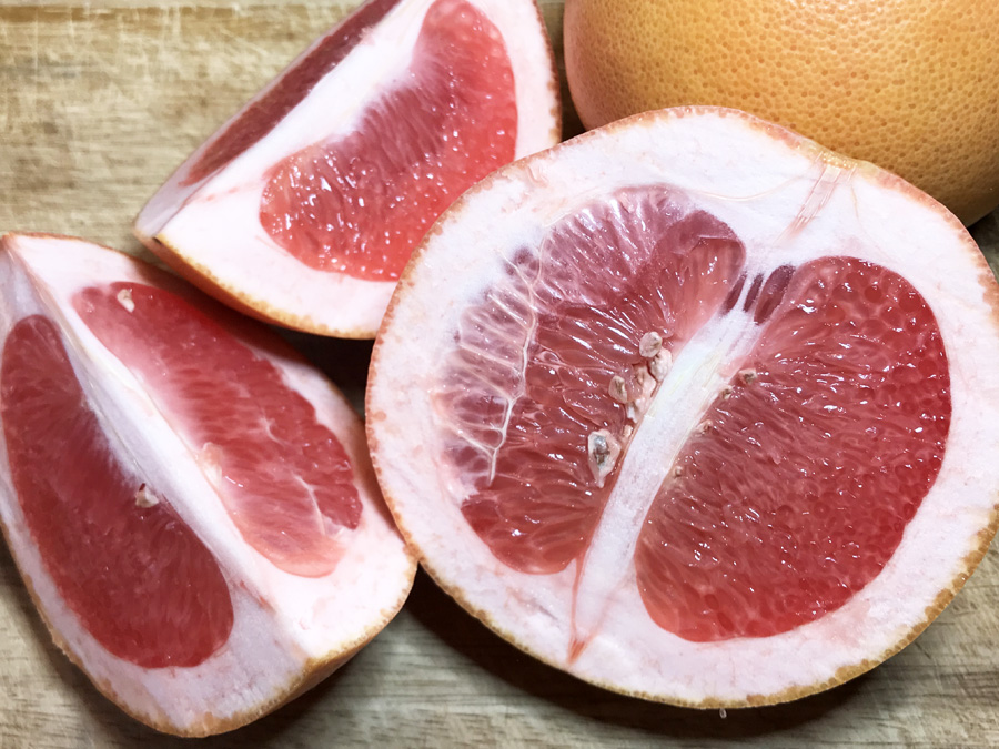 Кисло-сладкий цитрусовый плод представлен в двух вариантах: белый грейпфрут, мякоть которого светло-желтая, и красный грейпфрут — с мякотью от розового до красного цветов.