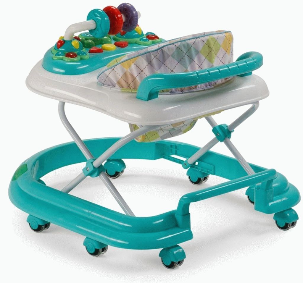 Достаточно дорогая модель, которую можно превратить из ходунков в столик для кормления. Корпус достаточно устойчив, опирается на 4 колеса, которые способны блокироваться при приближении ребёнка к лестничному пролёту. Безопасность вообще очень хорошо продумана – наличествуют тормоза и фиксаторы.