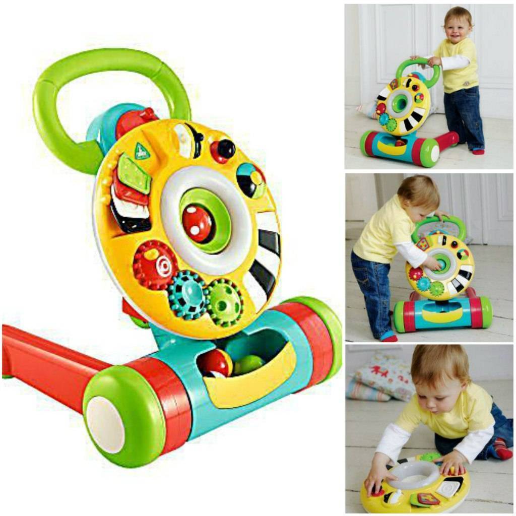У этого изделия очень хорошая игровая поверхность, в которой имеются многочисленные игрушки, музыкальные инструменты, различные датчики. При снятии панели ходунки трансформируются в кормильный столик или качалку.