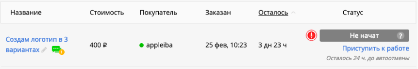 Как видите, статус стоит «Не начат», это значит, что нужно активировать выполнение заказа. Для этого перейдите вниз страницы заказа и кликните на кнопку «Приступаю к работе». Но сначала удостоверьтесь, что покупатель предоставил все необходимые для выполнения данные.
