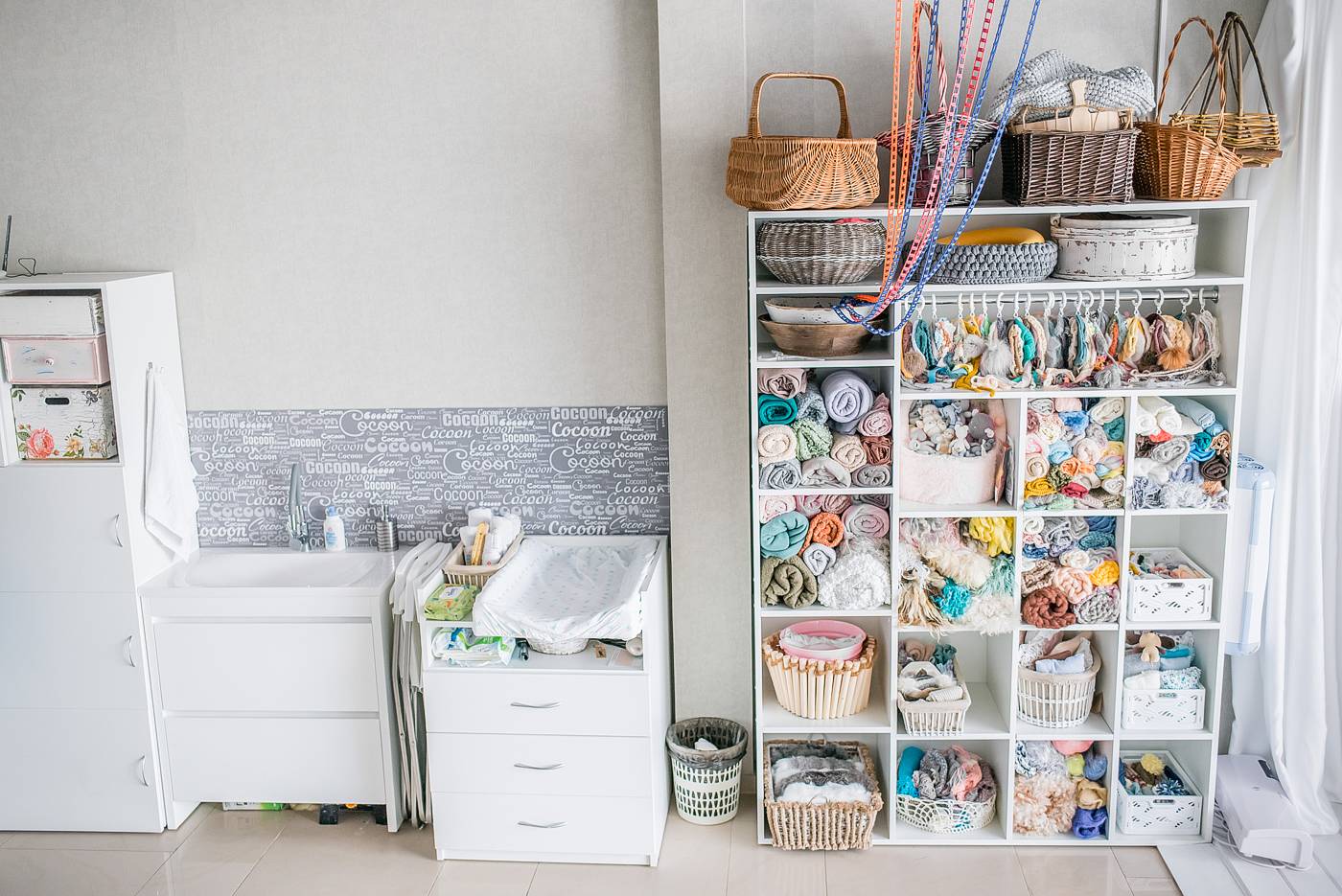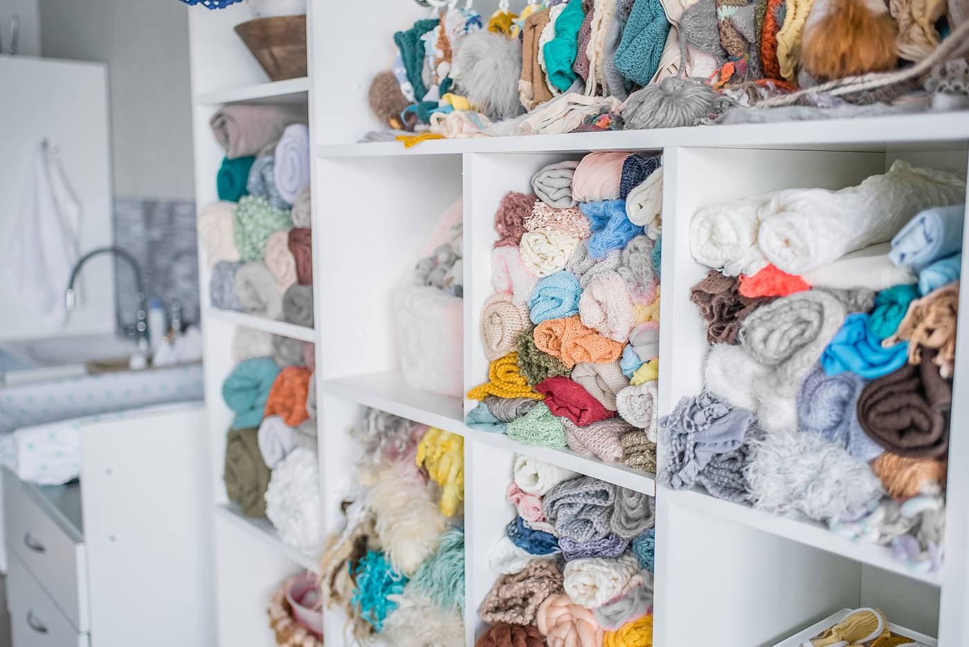 Поскольку такое направление как фотосессия новорожденных постоянно находится под влиянием модных тенденций, то фотографам приходится иметь целый арсенал различных шапочек, бантиков, десятки метров различных тканей, корзинки и прочую атрибутику. Все аксессуары должны быть в одной цветовой гамме и сочетаться с фоном. Либо наоборот контрастировать с фоном (но между собой по прежнему быть в одной цветовой гамме).