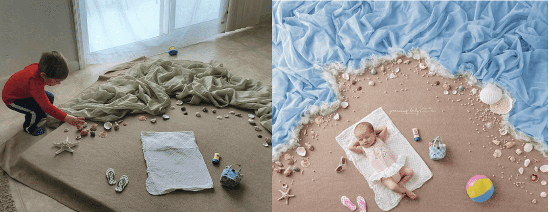 - Провести 4 последовательные съемки, чтобы показать как вырос малыш. Для сравнения можно использовать игрушку, одеяло пэчворк и даже маму или папу.