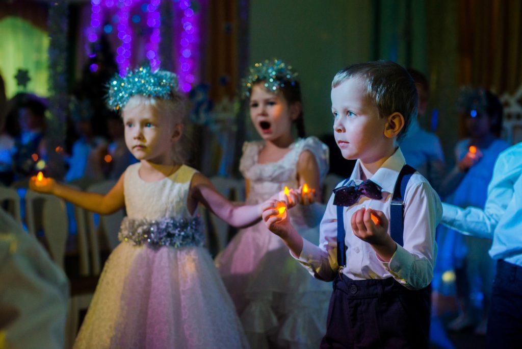 Помещения в дошкольных учреждениях редко бывают хорошо освещены. Даже если это сравнительно большой актовый зал, света может не хватить, особенно если на улице пасмурный день. Теоретически можно использовать вспышку, но этого делать как раз не рекомендуется. Дети будут отвлекаться на неожиданные световые вспышки, а некоторых это может просто испугать. Один или два общих снимка ещё можно сделать со вспышкой, но постоянно нервировать детей нельзя. Для подсветки детского концерта можно захватить с собой небольшой светильник, который можно установить на штативе. Это позволит выделить выступающих ребятишек, при этом приглашённые взрослые будут находиться немного в тени. Официальный фотограф может принести с собой световое оборудование и до начала праздника выставить правильный свет. Для того, чтобы фото с детского утренника получились на должном уровне, нужно использовать правильные настройки фотоаппарата.