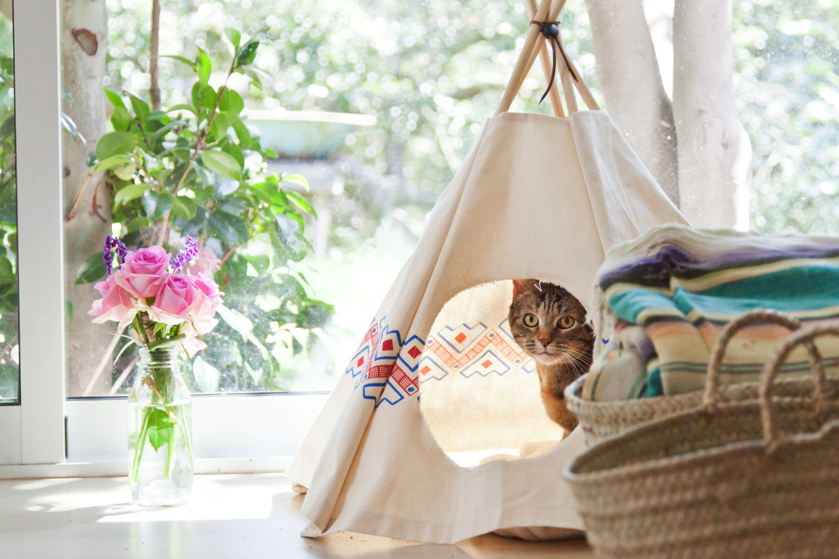 2. Шалаш для кота быстро соорудить из трех веток и ткани.