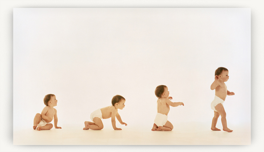 В период ползания на четвереньках ребенок пытается самостоятельно вставать. К полугоду он уже самостоятельно сидит, переворачивается со спины на живот и обратно. Затем он совершает пробные шаги, держась при этом за руку или опору (кровать, стул, движущуюся игрушку и пр.). И только потом он начинает пытаться ходить сам.