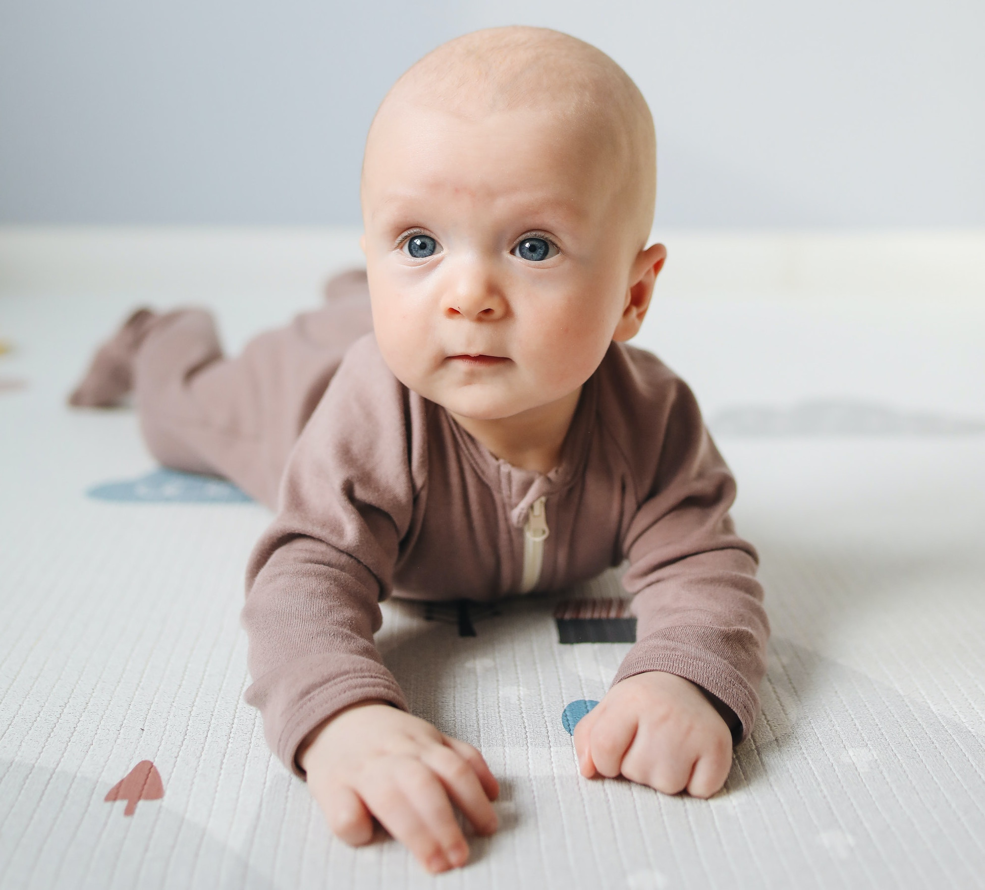 Перед тем как научить малыша ползать, нужно одеть его в удобную одежду, которая не сковывает движения.