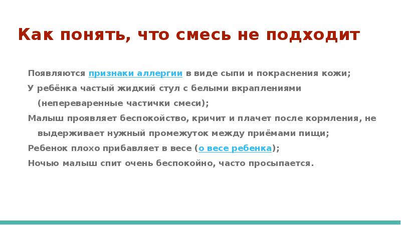 Подобрать ребенку оптимальную по составу смесь поможет педиатр. Далее женщина должна внимательно следить за состоянием здоровья своего ребенка. Смесь не подходит и срочно требует замены, если: