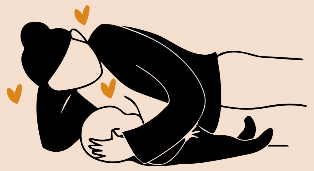 Мама и малыш лежат на боку и обращены друг к другу. В первые дни после родов такая позиция может быть неудобна из-за разницы в высоте соска и ротика малышка.