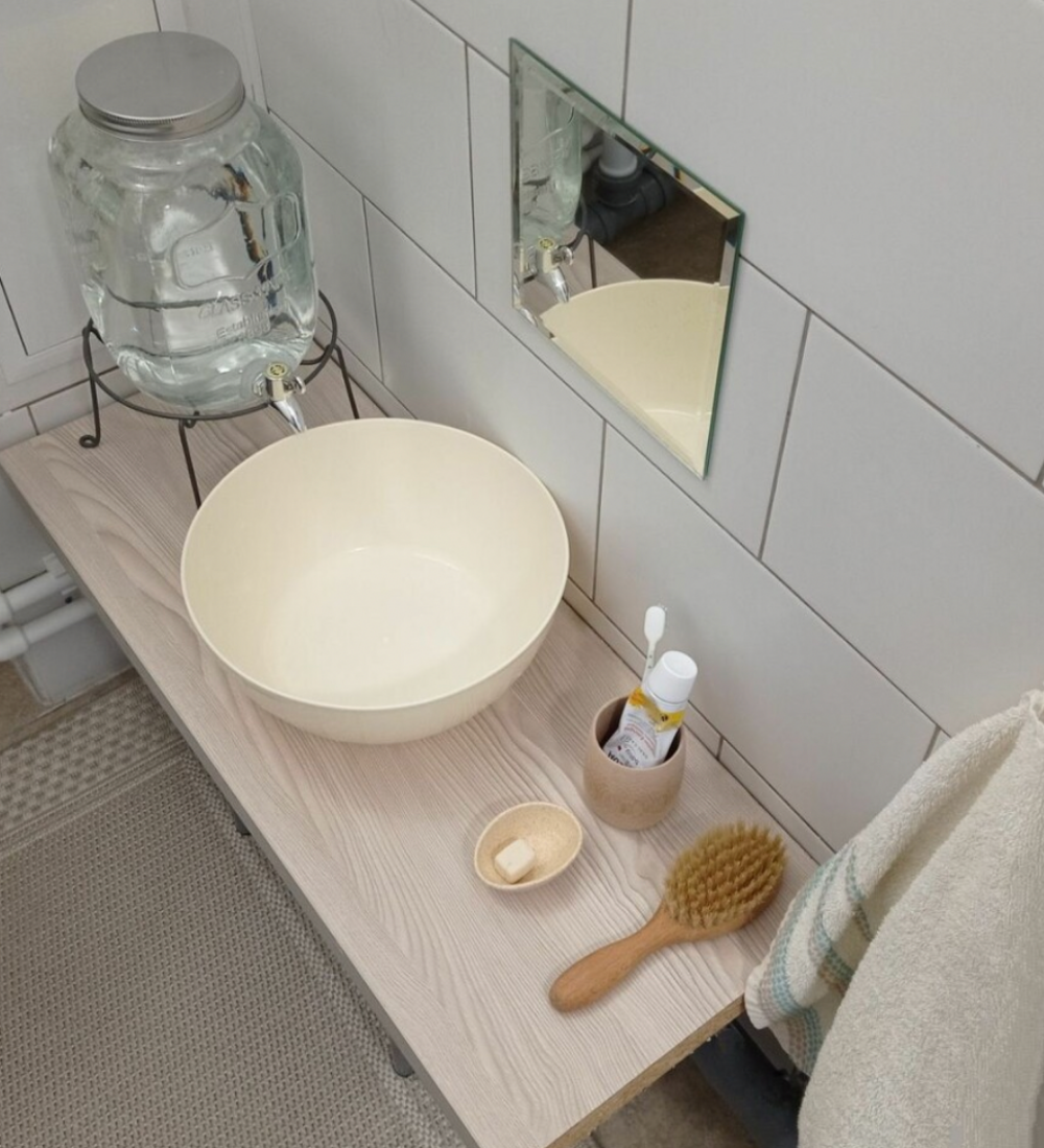Среда: зона ухода за собой. Эта зона предполагает доступ к воде, его можно обеспечить с помощью детской ступеньки или башни помощника (в ней ребёнок будет чувствовать себя безопаснее). Разместите в этой зоне зубную щётку, пасту, стаканчик для полоскания рта, жидкое мыло (или кусковое, соразмерное ладошке малыша), полотенце, расчёску.