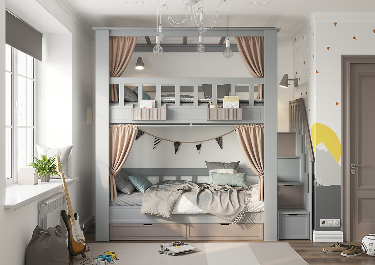 Для родителей важны материалы, из которых сделана детская мебель, прочность креплений и безопасность. Но в выборе дизайна комнаты прислушайтесь к мнению ребёнка. Какие герои мультфильмов ему нравятся? Может, он мечтает о кроватке-домике или «корабле»? Горки и лестницы, необычные стилизации — всё это осуществимо.
