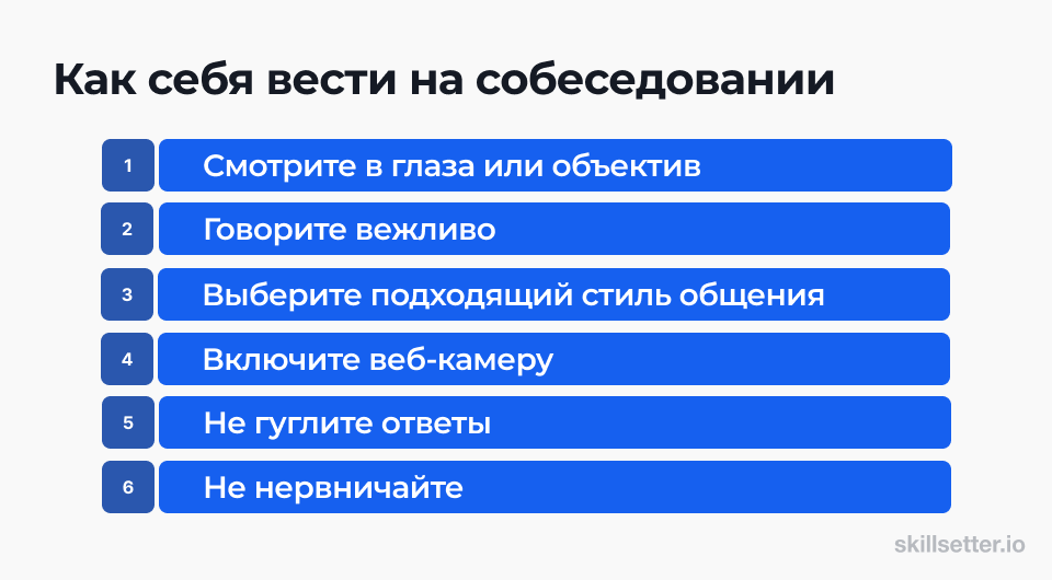 Что нужно для собеседования и как оно проходит: это более предметное общение по вашему опыту, по выполнению тестового задания, по условиям сотрудничества и заданиям, которые перед вами будут ставить, если возьмут на работу. Как раз на этом этапе вы можете столкнуться с одним из видов интервью, описанных выше.