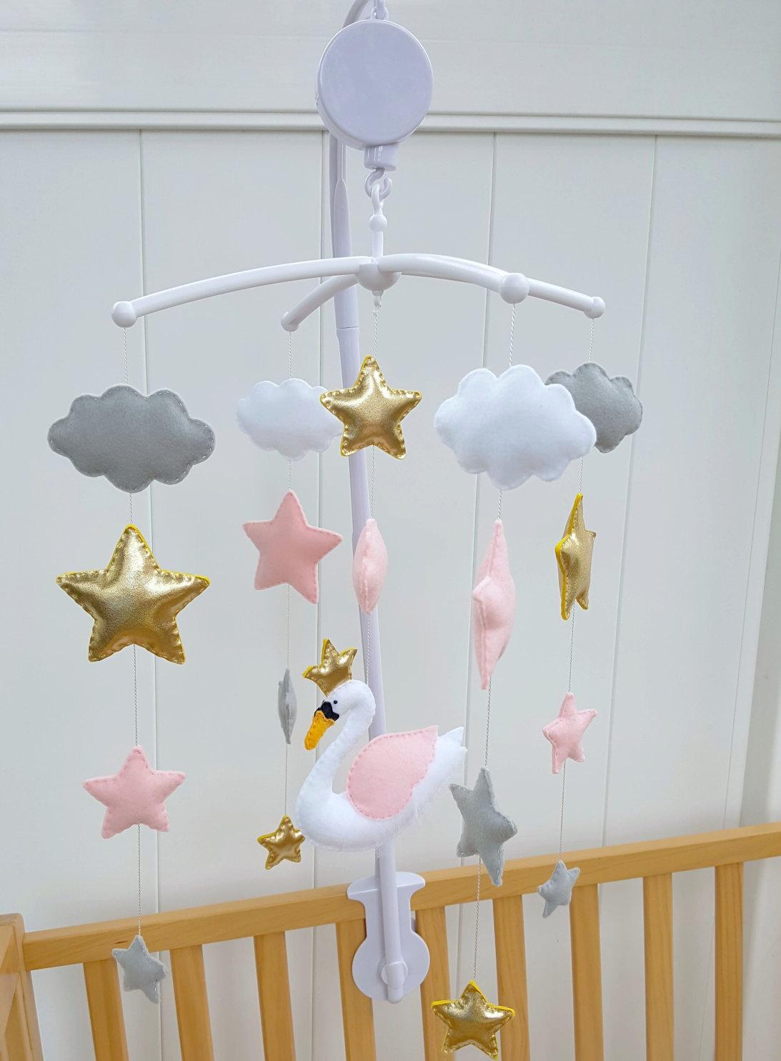 Музыкальный мобиль — крутящиеся и вращающиеся музыкальные игрушки, которые вешают над изголовьем детской кроватки. Они развивают зрение, слух и восприятие малыша, положительно влияют на моторику и мышечный тонус. Такие изделия эффективно занимают детей до полугода, ведь новорожденные любят следить за перемещающимися разноцветными объектами, особенно если движение сопровождает тихая музыка. Малыш пролежит в кроватке спокойно до получаса, разглядывая игрушки!