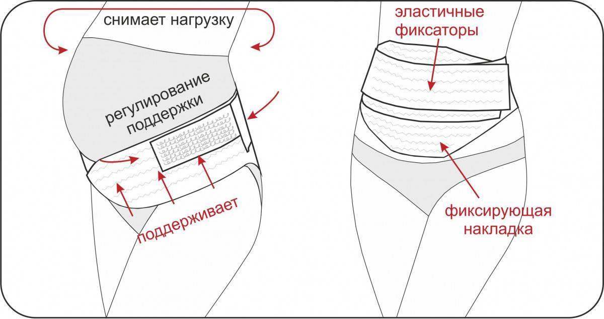 Бандаж-пояс: представляет собой широкую эластичную ленту, которая закрепляется липучкой под животом. Его надевают на нижнее бельё. Размер можно регулировать с помощью специальных клапанов. Удобен такой бандаж тем, что закрывает совсем небольшой участок тела.