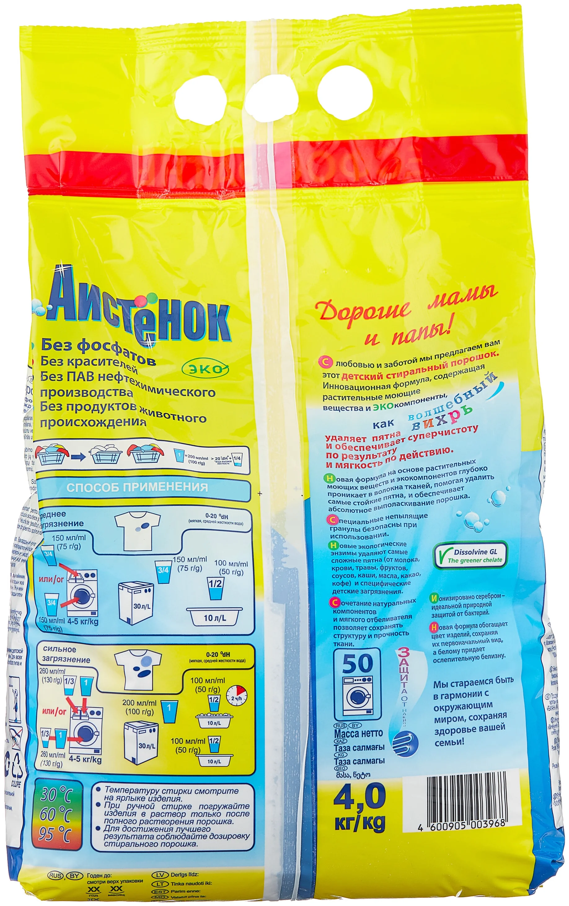 | Аистенок | Гипоаллергенный порошок с содержанием натурального мыла и алоэ вера, действует мягко и успокаивающе, удаляет трудные пятна, не подходит для стирки шерсти и шелка | Не подходит для стирки шерсти и шелка | 60 рублей (400 гр) |