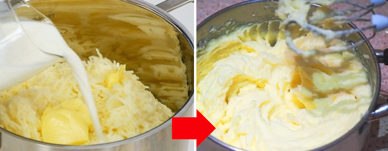После добавьте взбитое яйцо, снова перемните. После этого положите сливочное маслице и молоко и опять же основательно помните пюре.