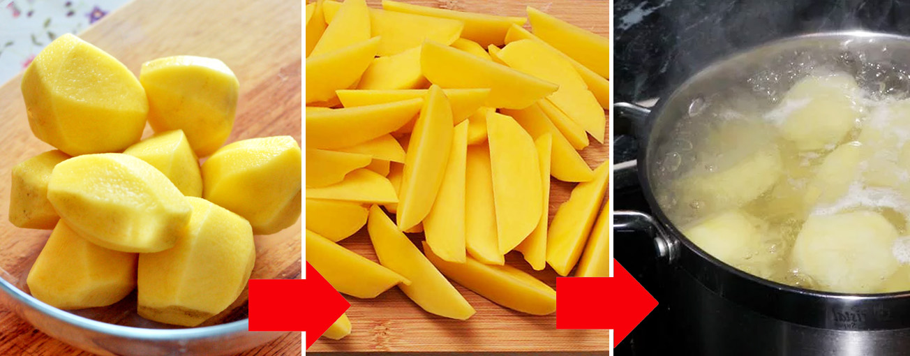 Первым делом нужно очистить картофель, хорошо промыть его. Разрезать каждую на несколько частей, сложить в кастрюлю, залить холодной водой. Сварить картошку до полной готовности, посолить.
