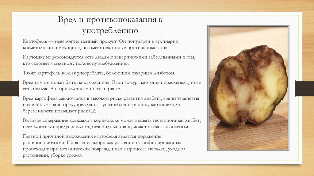 Картофель может представлять опасность для беременных женщин даже не страдающих ни одним из вышеперечисленных заболеваний, если будет входить в их рацион на постоянной основе. Из-за большого количества крахмала этот овощ способствует быстрому набору веса. Избежать этого возможно, если выбирать светлые клубни (сердцевина должна быть белой, а не желтой), в них меньше всего крахмала, а, следовательно, и вредных калорий.