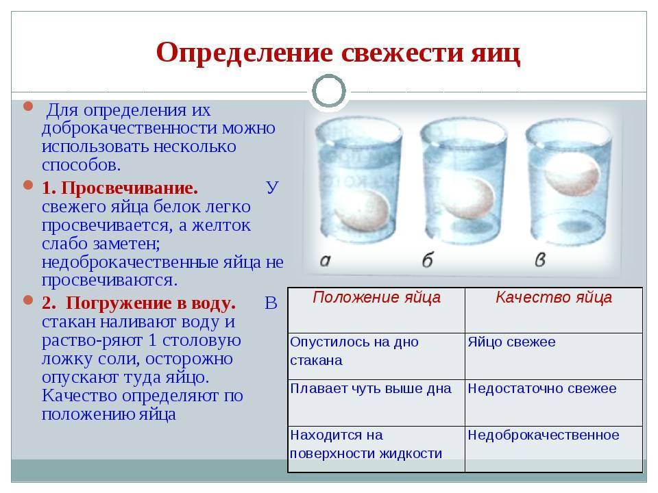 Свежесть продукта; Репутация продавца; Целостность скорлупы (лучше отказаться от продуктов, имеющих сколы или трещины); Чистота – слишком чистые яйца лучше не покупать, так как в процессе обработки с них удалили защитную пленку, без нее продукт испортится быстрее; Важно, чтобы продукт не был старым, залежавшимся; Чтобы проверить яичко на свежесть, его нужно опустить в емкость с холодной водой. Если продукт свежий, то он должен опуститься на дно (по «возрасту» не старше недели), если нет – останется на поверхности. В последнем случае потреблять в пищу продукт нельзя никому: ни детям, ни взрослым