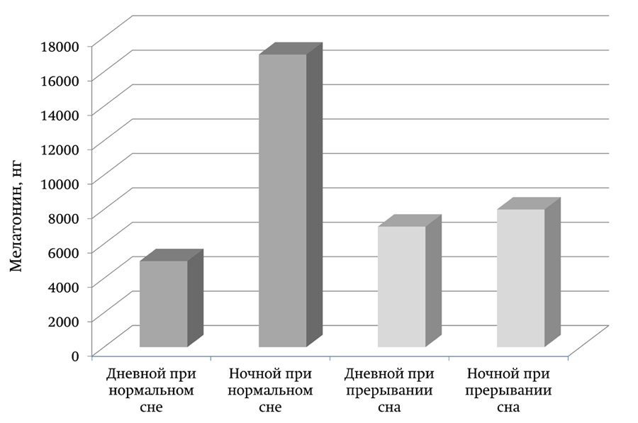 Как видно на диаграмме, прерванные объятия Морфея дают возможность выработать примерно половину того уровня мелатонина, который обеспечивает полноценный сон. Суточная выработка мелатонина также снижается. Однако при этом днем синтез мелатонина усиливается, что приводит к сонливости. Узнаваемая ситуация, не так ли?