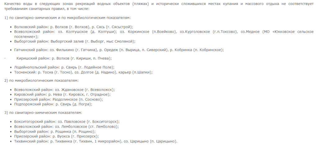 В остальных купальных местах Ленинградской области качество воды не соответствует требованиям санитарных правил: