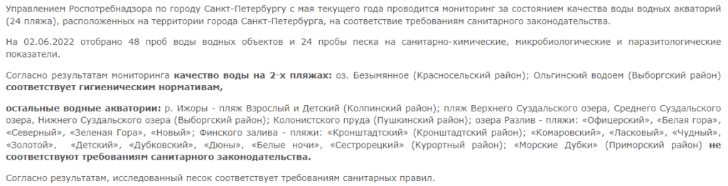 Остальные водоёмы города не соответствуют гигиеническим нормативам! Не рекомендуются пляжи в Приморском парке 300-летия, в Колпино, Кронштадте, так же Суздальские озёра, река Ижора и другие. То есть практически всё.