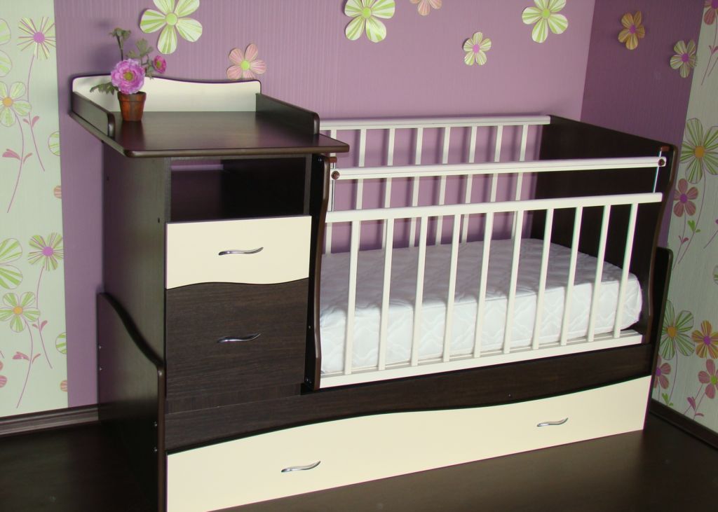 Трансформеры можно преобразовывать: увеличивать размеры за счет перестановки элементов (снимать бортики, раскладывать дно). Некоторые модели дополняются пеленальным столом, выдвижными ящичками, вместительным комодом.