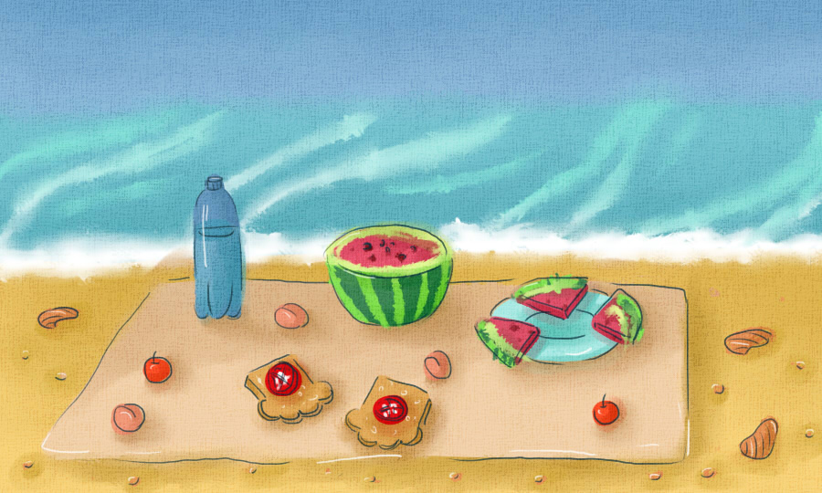 Обязательно возьмите достаточное количество воды. В жару ребенка стоит регулярно поить, чтобы избежать обезвоживания. Подойдет негазированная вода или сок. Каши, молочные продукты и другую скоропортящуюся еду берите с собой только в сумке-холодильнике и старайтесь съесть в первые два часа после прихода на пляж.