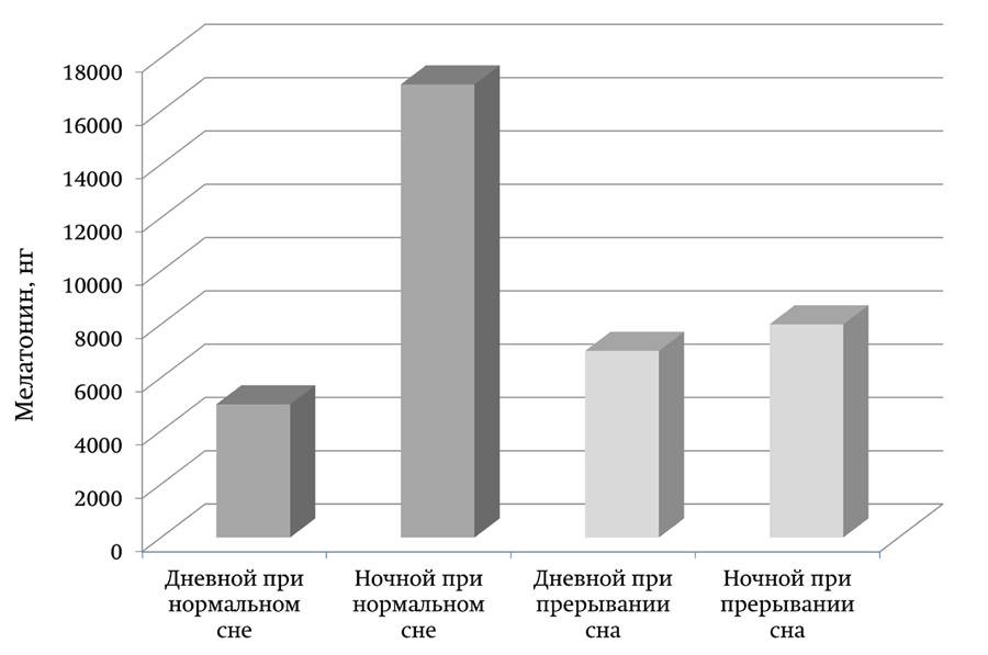 Как видно на диаграмме, прерванные объятия Морфея дают возможность выработать примерно половину того уровня мелатонина, который обеспечивает полноценный сон. Суточная выработка мелатонина также снижается. Однако при этом днем синтез мелатонина усиливается, что приводит к сонливости. Узнаваемая ситуация, не так ли?
